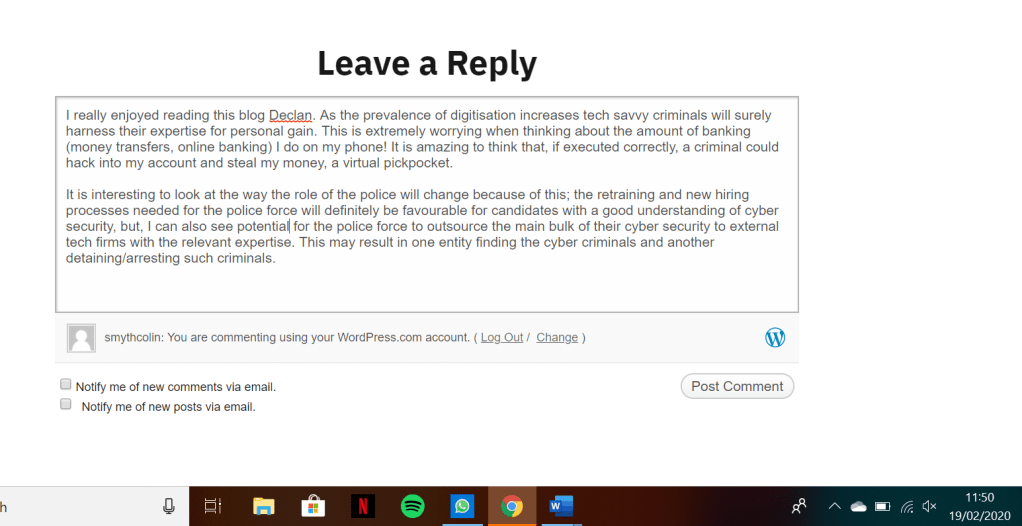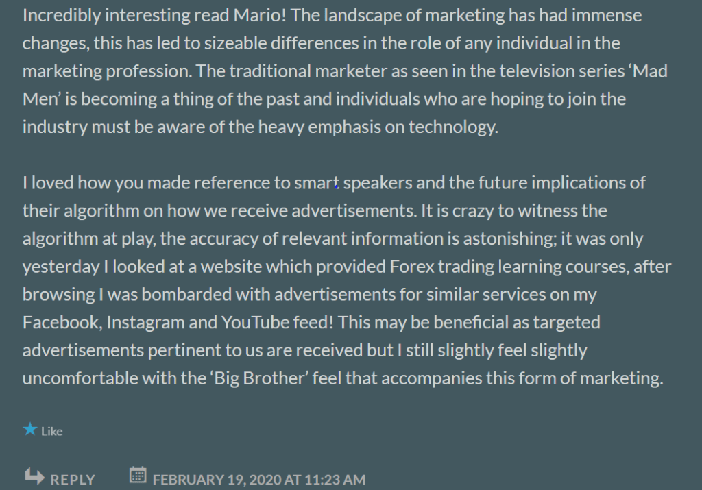 I further enjoyed learning about how important it is to create a digital identity which portrays an image of oneself which is inline with how your wish to be represented. In a professional context, I gained a heightened understanding of how important Linkedin activity and digital networking is. I thoroughly enjoyed the seminar in which two past students shared their experiences using Linkedin to aid their careers, this provided relatable and real-world applications to what we have been exploring in the module. The notion of an online identity also increased my conscious of what I should and shouldn’t associate myself with on social media accounts when presenting myself online.
